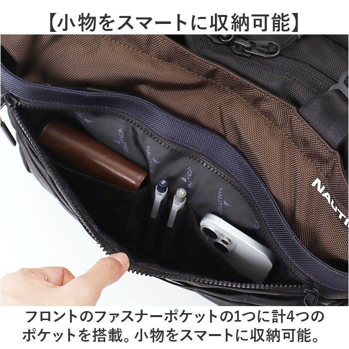 ・フロントのファスナーポケットの1つに計4つのポケットを搭載。小物をスマートに収納可能。