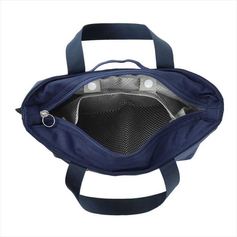 ・内側メッシュポケットは反対側のホックで留めて宙吊りポケットにできます。吊りポケットに凍らせたペットボトルを入れて、上からの位置で保冷することもできる便利なつくり。