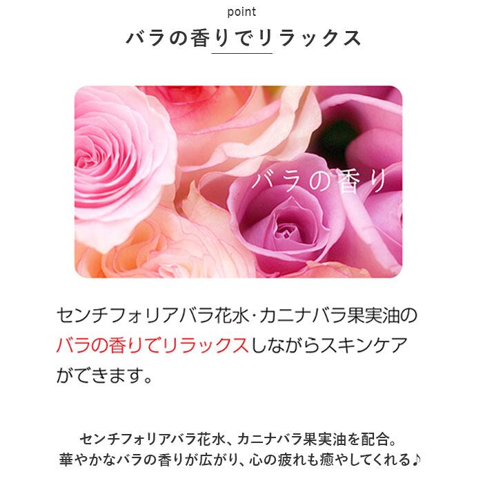 ・センチフォリアバラ花水、カニナバラ果実油を配合。華やかなバラの香りが広がり、心の疲れも癒やしてくれる♪