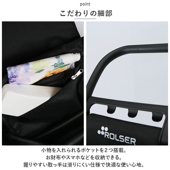 ・小物を入れられるポケットを2つ搭載。お財布やスマホなどを収納できる。握りやすい取っ手は滑りにくい仕様で快適な使い心地。