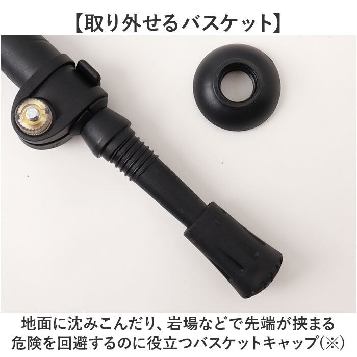・地面に沈みこんだり、岩場などで先端が挟まる危険を回避するのに役立つバスケットキャップ※