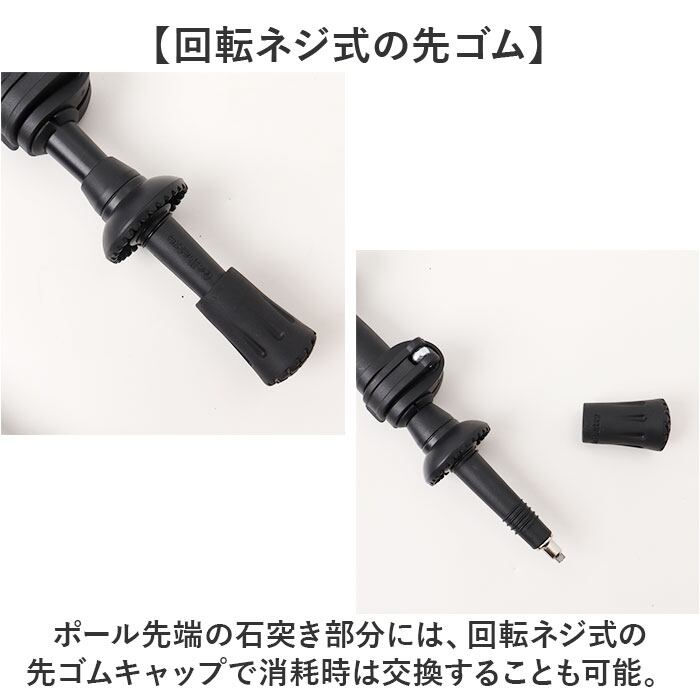 ・ポール先端の石突き部分には、回転ネジ式の先ゴムキャップで消耗時は交換することも可能。