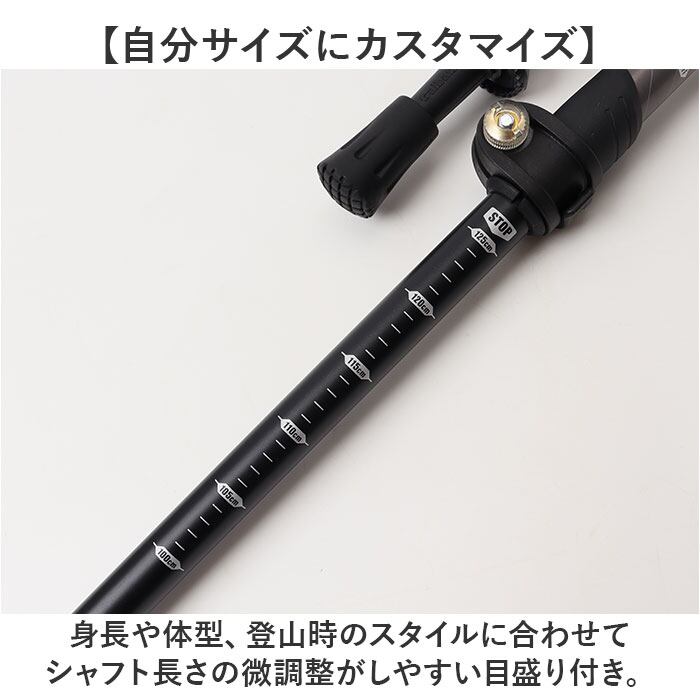 ・身長や体型、登山時のスタイルに合わせてシャフト長さの微調整がしやすい目盛り付き。