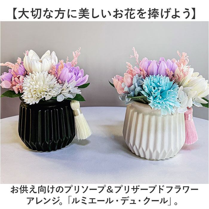 ・お供え向けのプリソープ&プリザーブドフラワーアレンジ。「ルミエール・デュ・クール」。