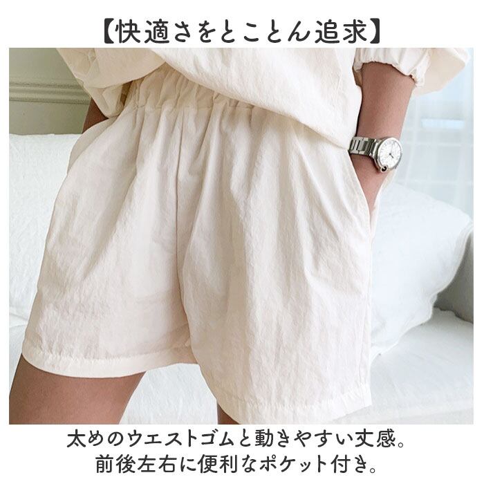 ・太めのウエストゴムと動きやすい丈感。前後左右に便利なポケット付き。
