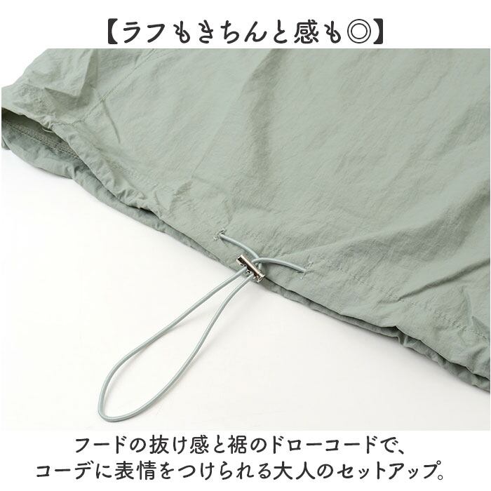 ・フードの抜け感と裾のドローコードで、コーデに表情をつけられる大人のセットアップ。