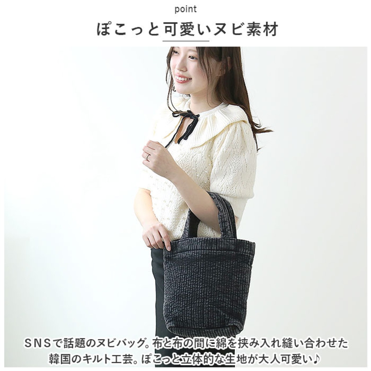 ・SNSで話題のヌビバッグ。布と布の間に綿を挟み入れ縫い合わせた韓国のキルト工芸。ぽこっと立体的な生地が大人可愛い♪