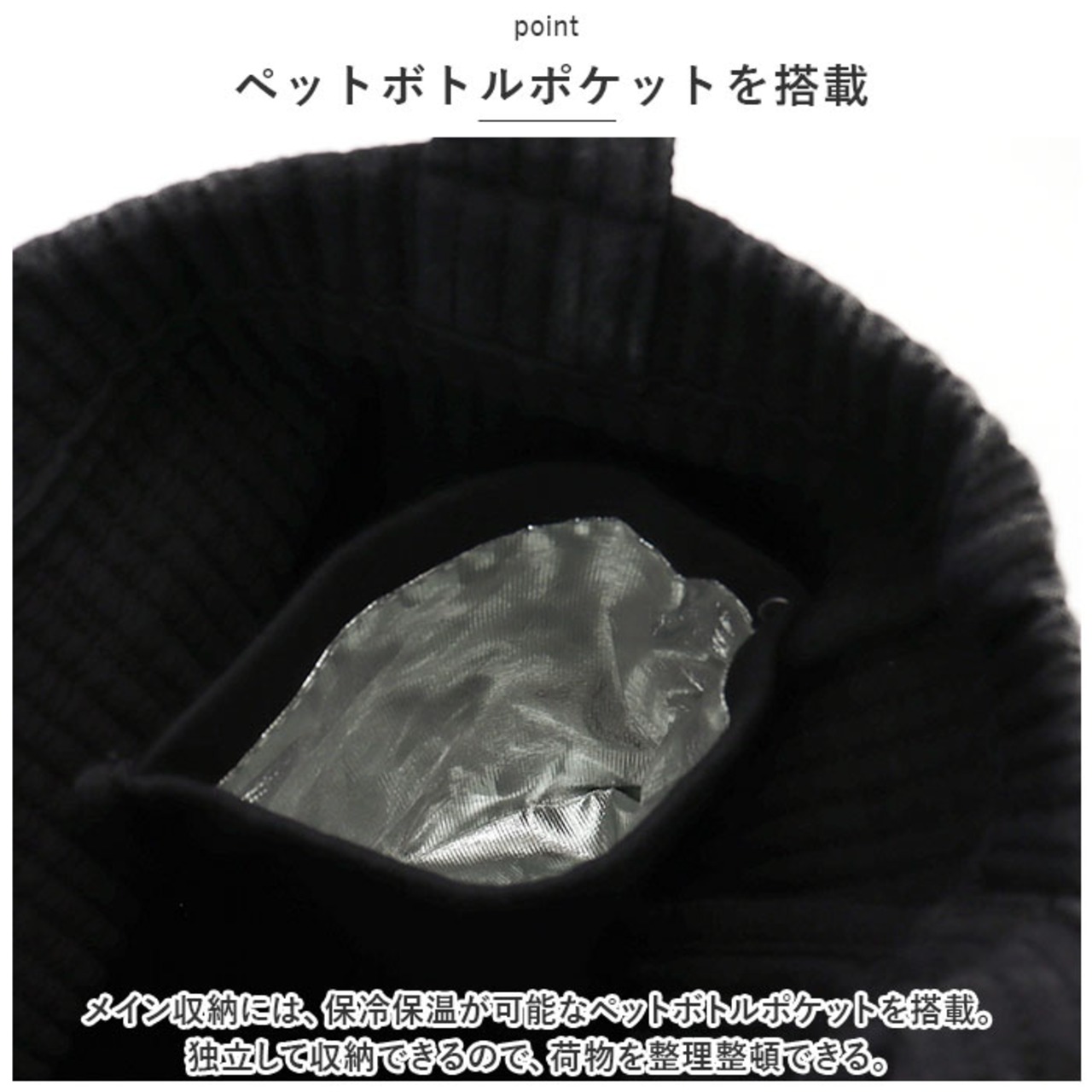 ・メイン収納には、保冷保温が可能なペットボトルポケットを搭載。独立して収納できるので、荷物を整理整頓できる。