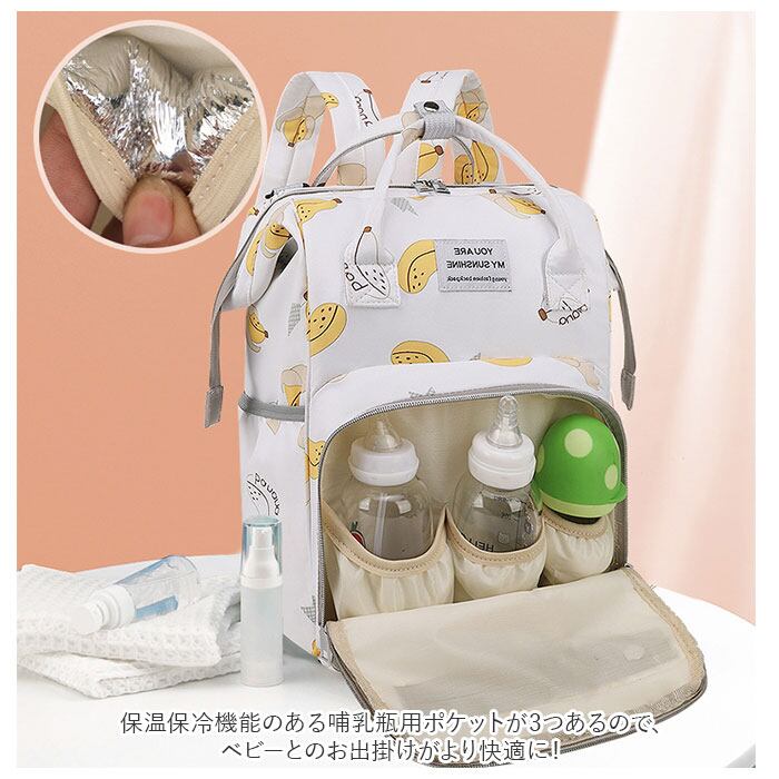 ・ラウンドファスナーポケット内側には、保温保冷機能のある哺乳瓶用ポケットが3つあるので、ベビーとのお出掛けがより快適に!