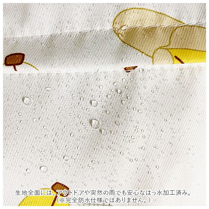 ・バナナやイチゴのようなフルーツ、王冠のプリント柄が可愛い生地全面には、アウトドアや突然の雨でも安心なはっ水加工済み。(※完全防水仕様ではありません。)