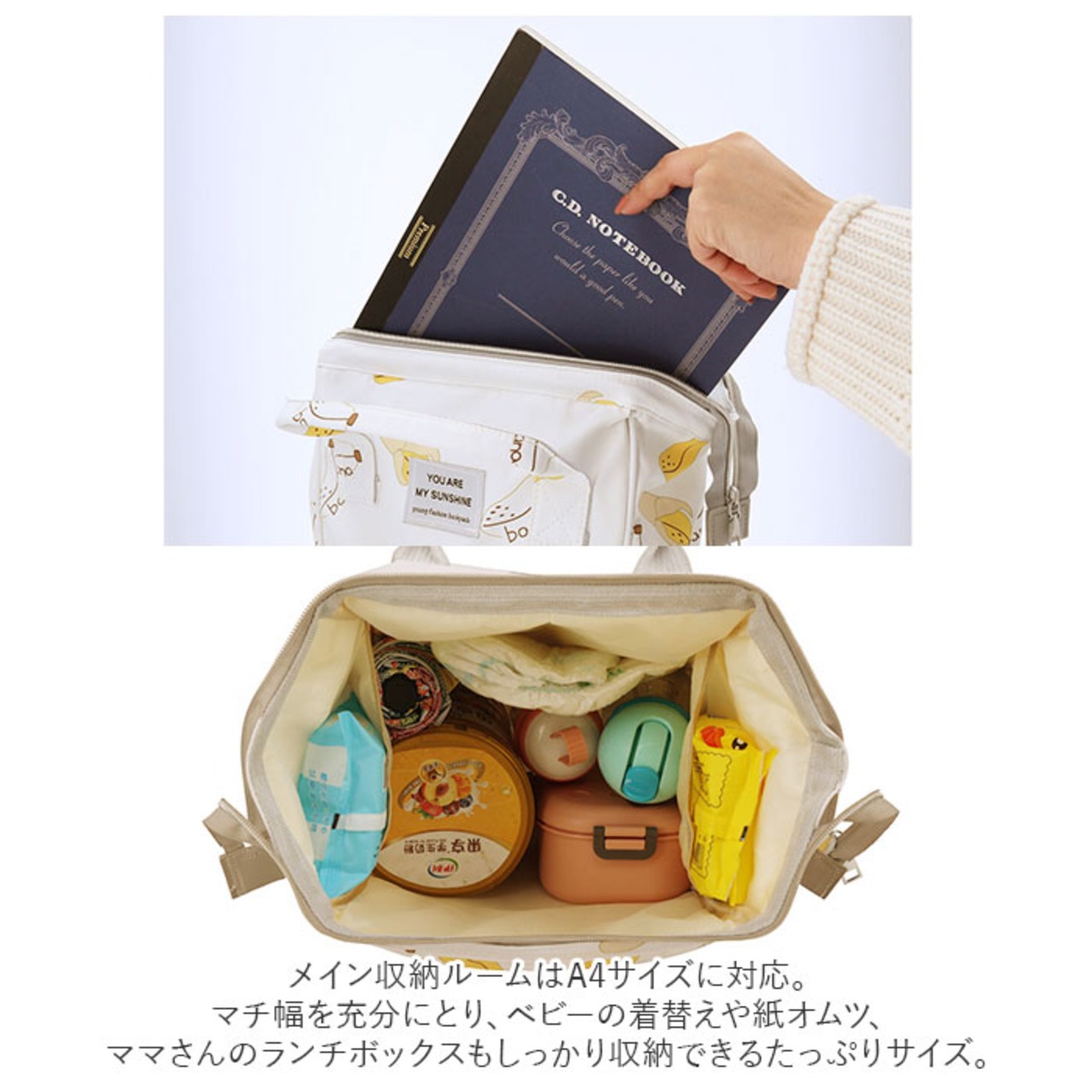 ・メイン収納ルームはA4サイズに対応。マチ幅を充分にとり、ベビーの着替えや紙オムツ、ママさんのランチボックスもしっかり収納できるたっぷりサイズ。