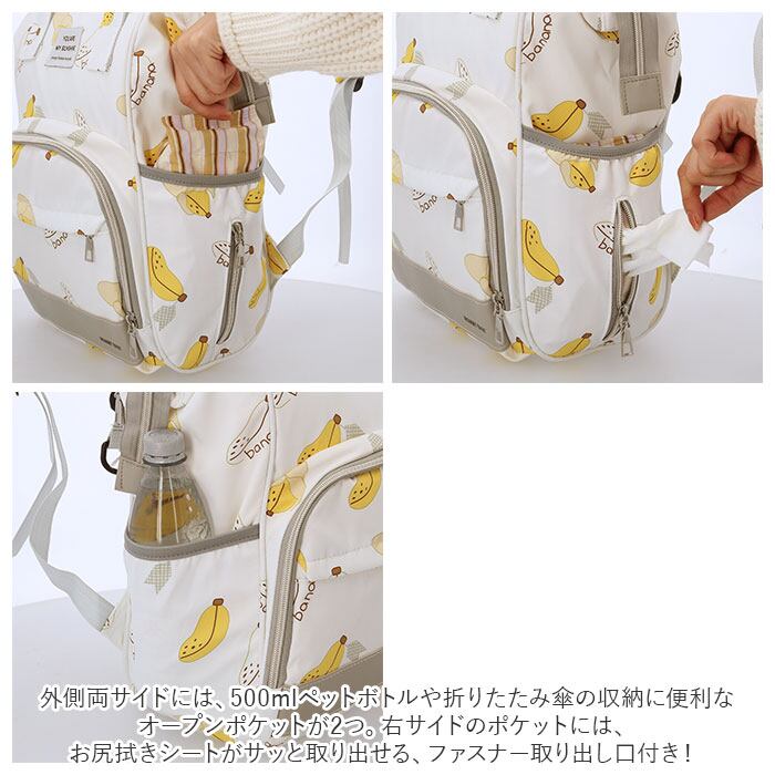 ・リュック外側両サイドには、500mlペットボトルや折りたたみ傘の収納に便利なオープンポケットが2つ。右サイドのポケットには、お尻拭きシートがサッと取り出せる、ファスナー取り出し口付き!