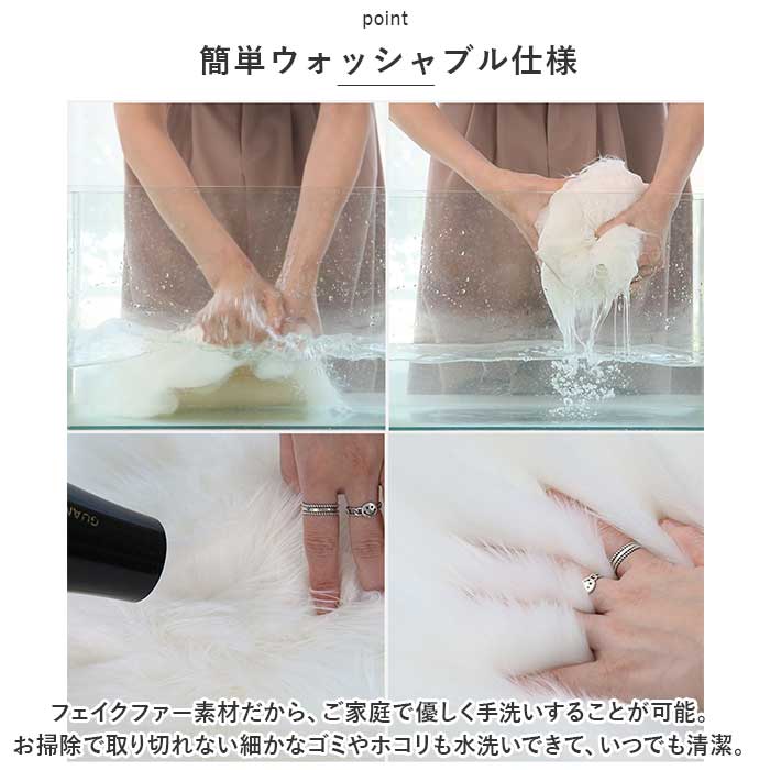 ・フェイクファー素材だから、ご家庭で優しく手洗いすることが可能。お掃除で取り切れない細かなゴミやホコリも水洗いできて、いつでも清潔。