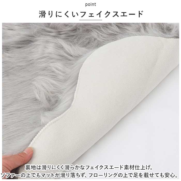 ・裏地は滑りにくく滑らかなフェイクスエード素材仕上げ。ソファーの上でもマットが滑り落ちず、フローリングの上で足を載せても安心。