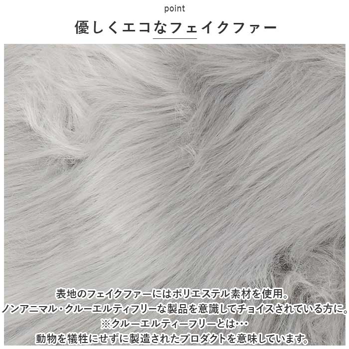 ・表地のフェイクファーにはポリエステル素材を使用。普段から化粧品等はノンアニマル・クルーエルティフリーな製品を意識してチョイスされている方に。(※クルーエルティーフリーとは・・・動物を犠牲にせずに製造されたプロダクトを意味しています。)