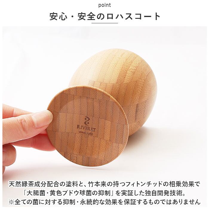 ・天然緑茶成分配合の塗料と、竹本来の持つフィトンチッドの相乗効果で「大腸菌・黄色ブドウ球菌の抑制」を実証した独自開発技術。(※全ての菌に対する抑制・永続的な効果を保証するものではありません。)