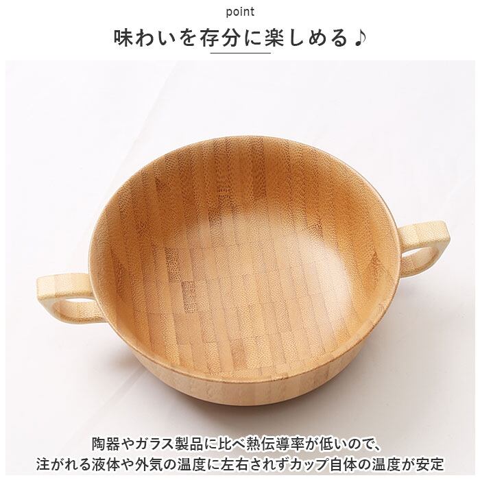 ・陶器やガラス製品に比べ熱伝導率が低いので、注がれる液体や外気の温度に左右されずカップ自体の温度が安定。