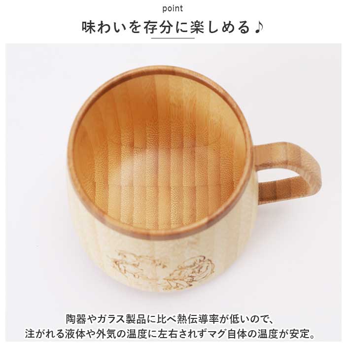 ・陶器やガラス製品に比べ熱伝導率が低いので、注がれる液体や外気の温度に左右されずマグ自体の温度が安定。