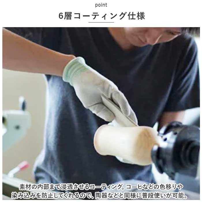 ・素材の内部まで浸透させるコーティング。コーヒなどの色移りや染み込みを防止してくれるので、陶器などと同様に普段使いが可能。