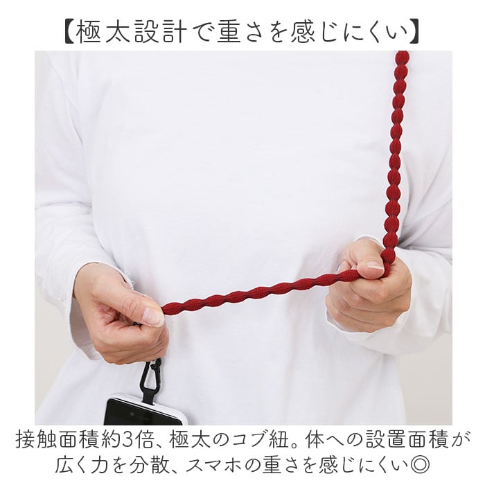 ・接触面積約3倍、極太のコブ紐。体への設置面積が広く力を分散、スマホの重さを感じにくい◎