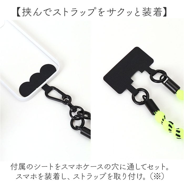 ・付属のシートをスマホケースの穴に通してセット。スマホを装着し、ストラップを取り付け。