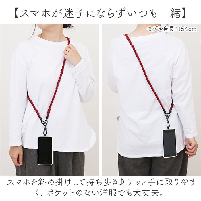・サイズ調節不要、引っ張るだけで紐全体が伸びる!体を寄せることなく、スマホを自由に使用。
