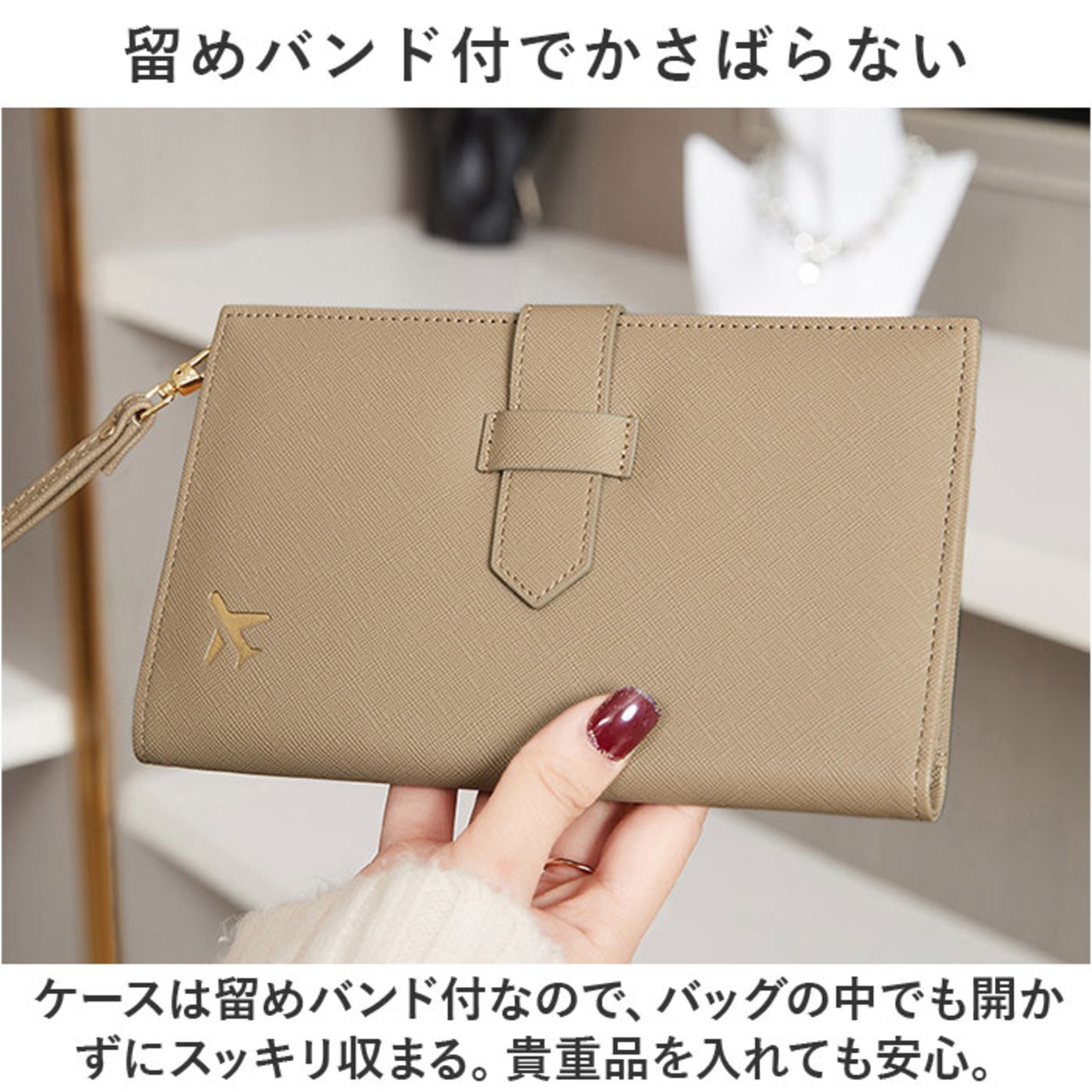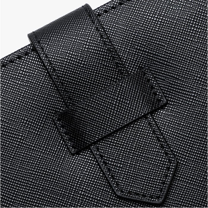 ・ケースは留めバンド付なので、バッグの中でも開かずにスッキリ収まる。貴重品を入れても安心。