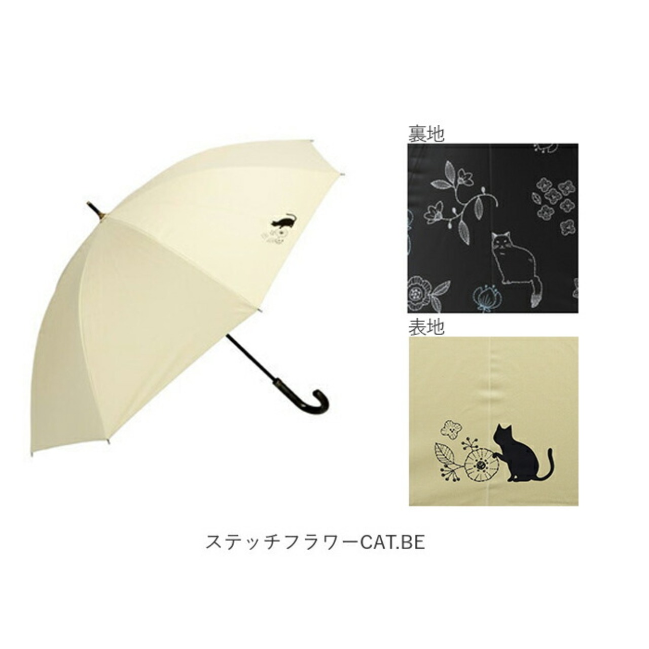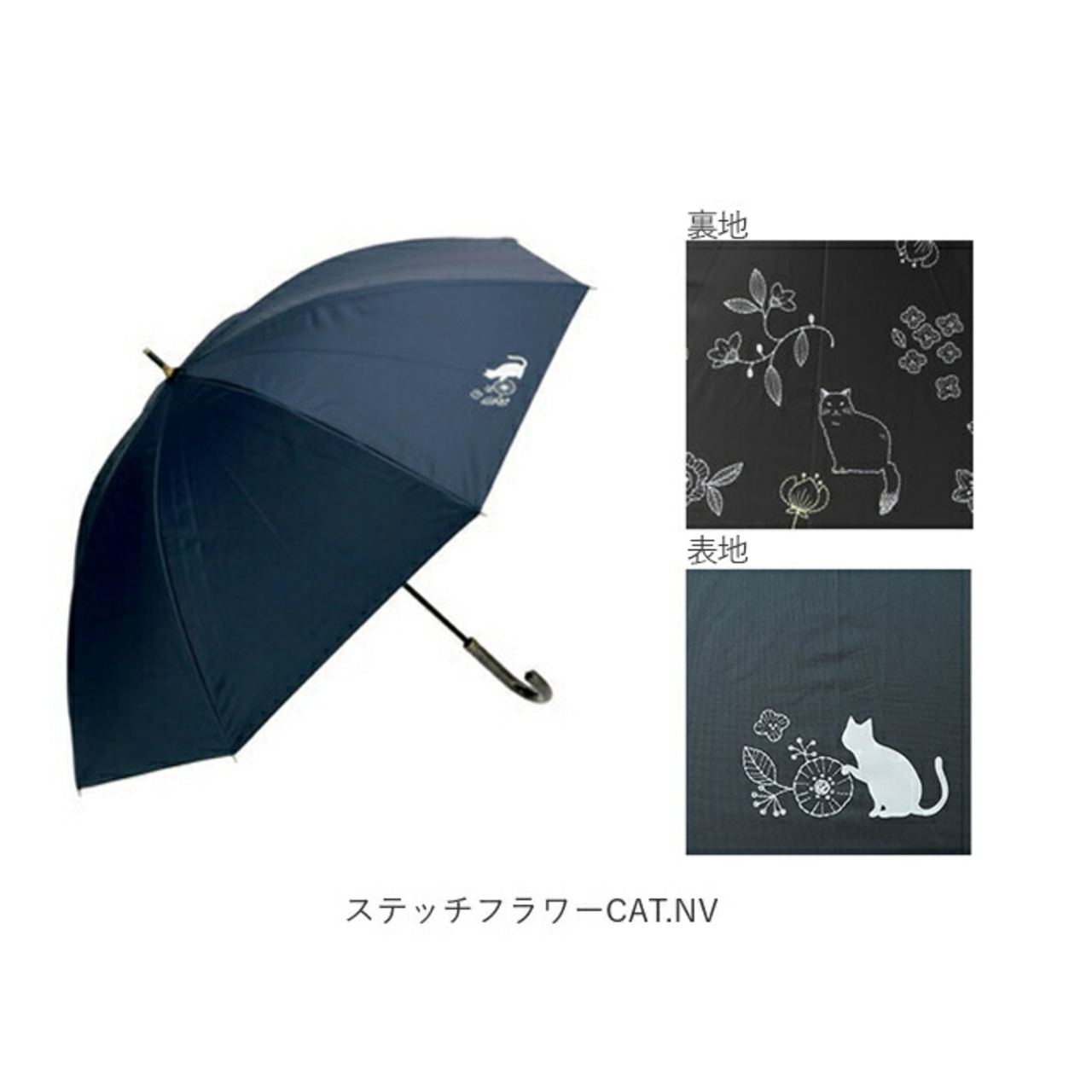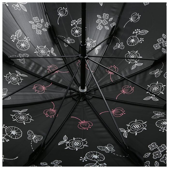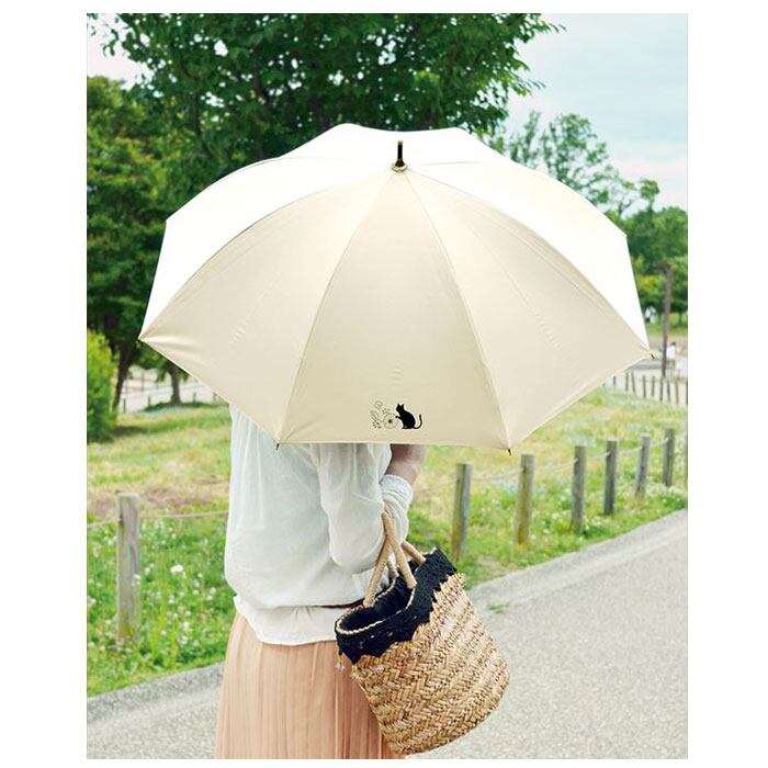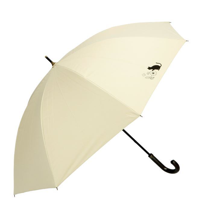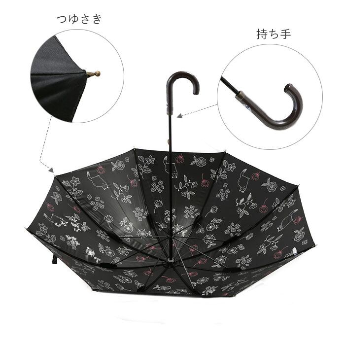 ・傘生地の内側にちりばめられた花とふくふくした猫が可愛らしい、晴雨兼用長傘(親骨50cm)。