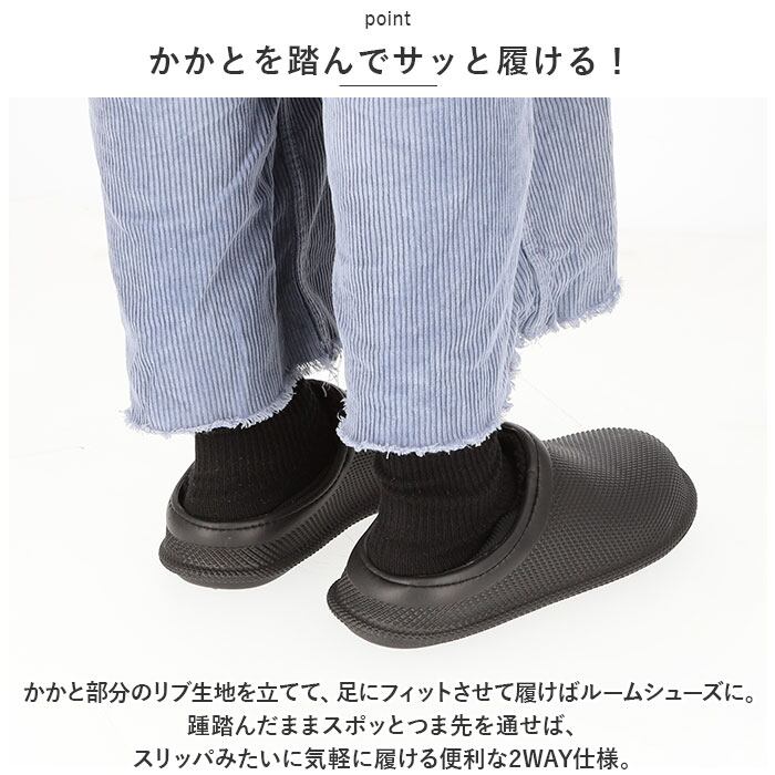 ・かかと部分のリブ生地を立てて、足にフィットさせて履けばルームシューズに。踵踏んだままスポッとつま先を通せば、スリッパみたいに気軽に履ける便利な2WAY仕様。