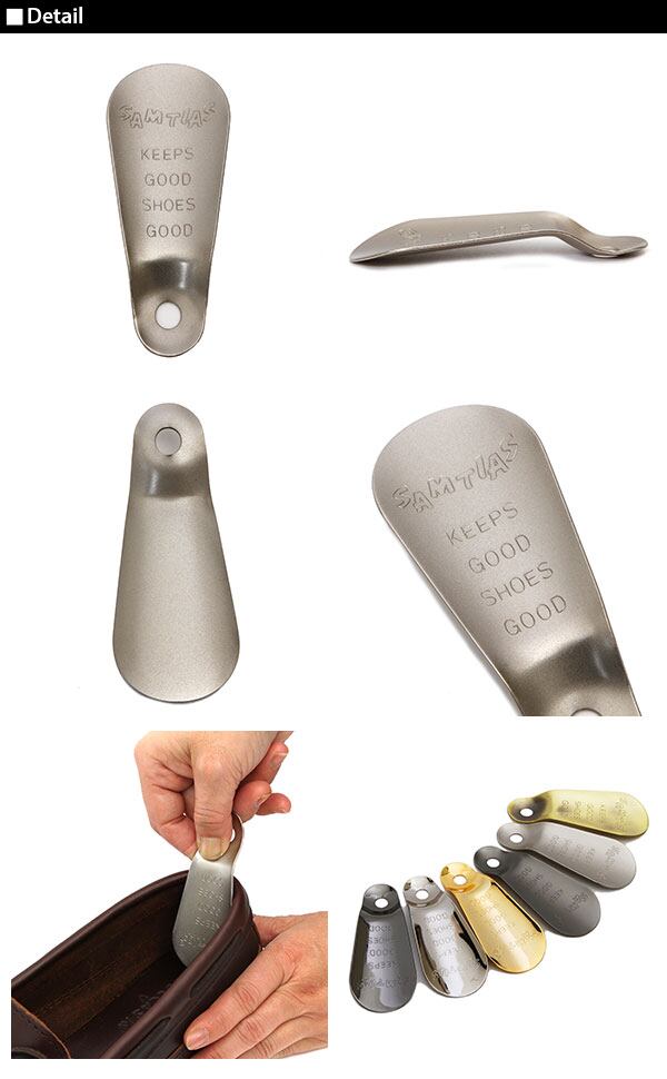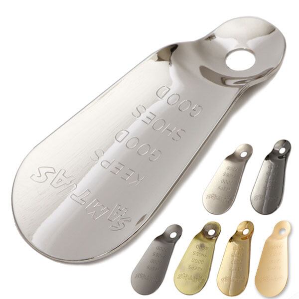 真鍮製の携帯用靴ベラです。サムティアスの刻印入りで、シックな雰囲気。軽量で薄いので持ち歩くのに適しています。厚みは約1mm。かかとに沿うなめらかなカーブ。上部の窪みがフィットするので持ちやすく使いやすい!キーホルダーに通してお使い頂くこともできます。