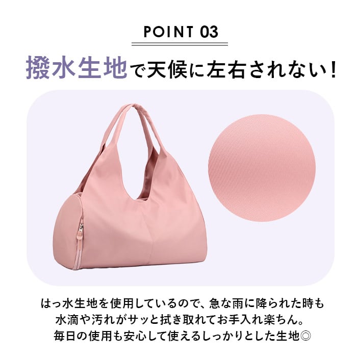 ・バッグ外側のサイドポケットは、運動靴や着用後のウェアが収納できる独立した立体ポケット。メインルームのランチボックスや着替えとは別のスペースに収納することができるので衛生的!