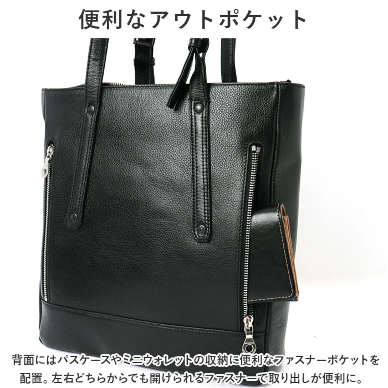 ・背面にはパスケースやミニウォレットの収納に便利なファスナーポケットを配置。左右どちらからでも開けられるファスナーで取り出しが便利に。