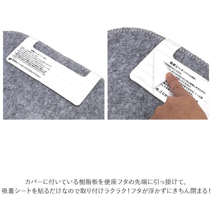 ・カバーに付いている樹脂板を便座フタの先端に引っ掛けて、吸着シートを貼るだけなので取り付けラクラク。