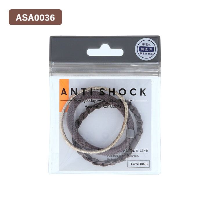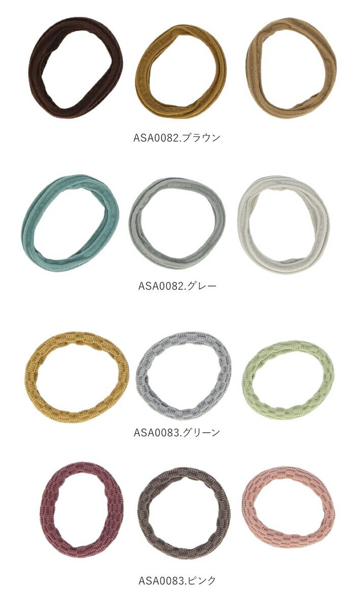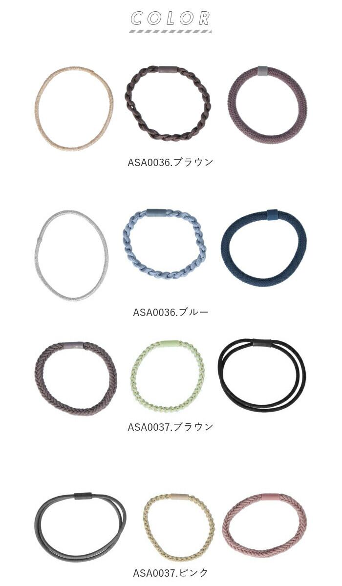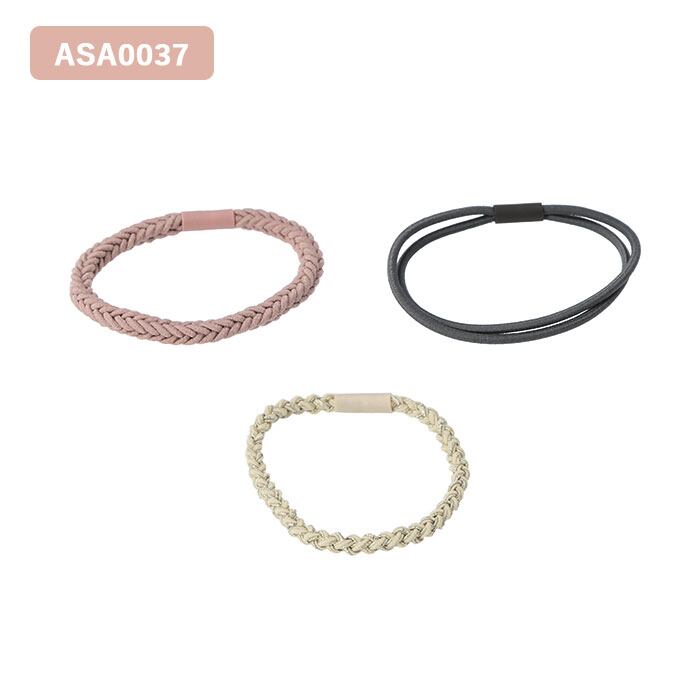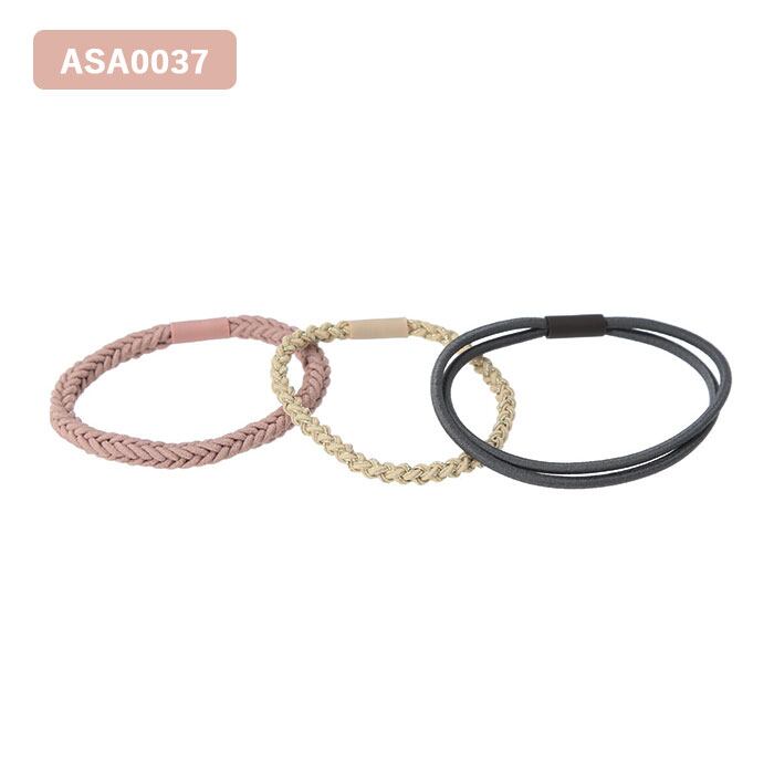 ・それぞれデザインや素材感の異なる、お得な3本セット。(※ASA0036シリーズは、ボリューム感のある太ゴム、ねじりゴム、ラメカラーの3本セット。ASA0037シリーズは、2種類の編み込みゴムと2重ゴムの3本セットになります。)