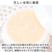 ・朝忙しい女性やお仕事をお持ちの方におすすめ。UVにも強いアルガンオイルとシアバターが配合されており、朝晩のスキンケアに使用できる。