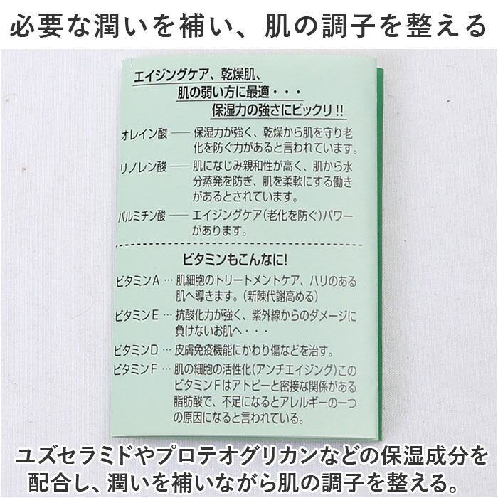 ・ユズセラミドやプロテオグリカンなどの保湿成分を配合し、潤いを補いながら肌の調子を整える。