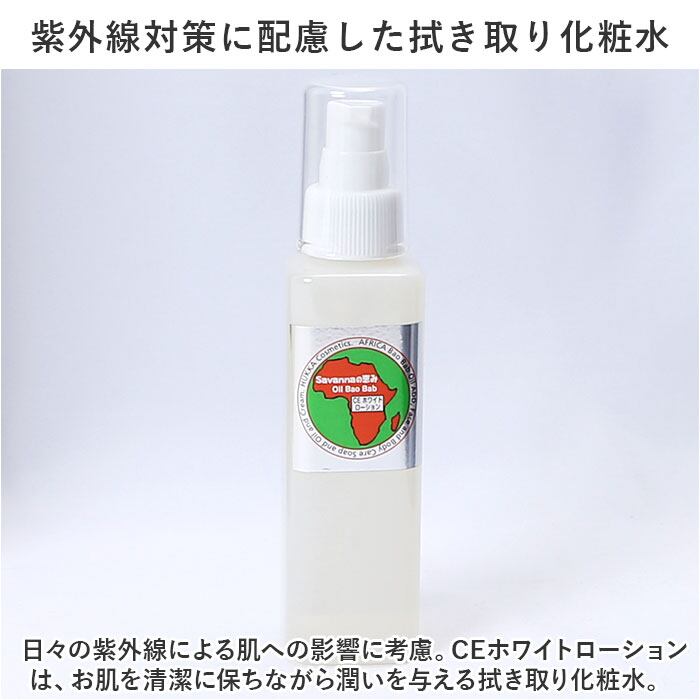 ・日々の紫外線による肌への影響に考慮。CEホワイトローションは、お肌を清潔に保ちながら潤いを与える拭き取り化粧水。