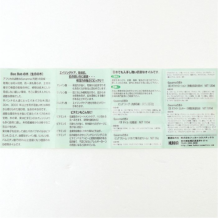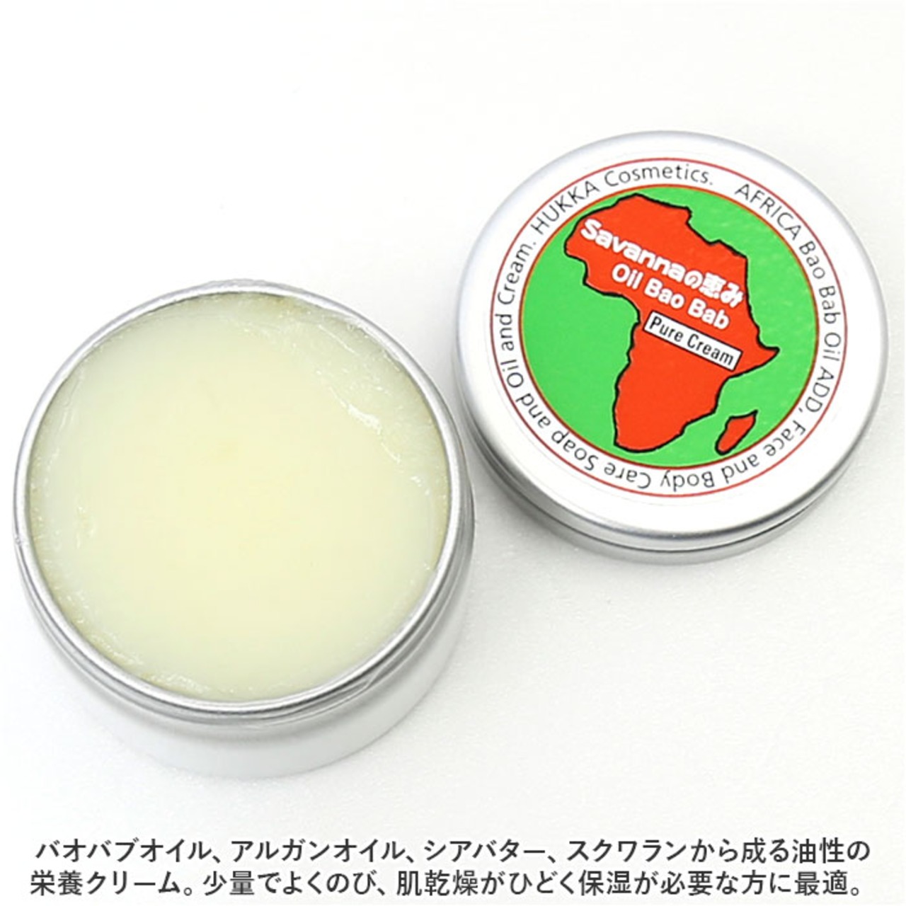 ・バオバブオイル、アルガンオイル、シアバター、スクワランから成る油性タイプの栄養クリーム。少量でよくのび、肌乾燥がひどく保湿が必要な方に最適。