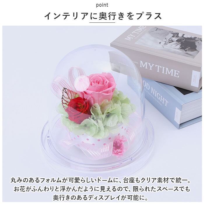 ・丸みのあるフォルムが可愛らしいドームに、台座もクリア素材で統一。お花がふんわりと浮かんだように見えるので、限られたスペースでも奥行きのあるディスプレイが可能に。