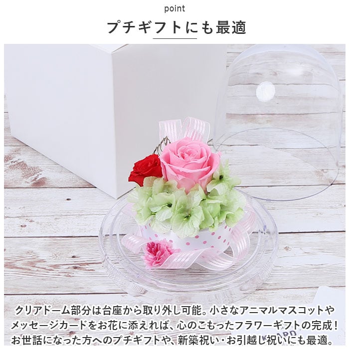 ・クリアドーム部分は台座から取り外し可能。小さなアニマルマスコットやメッセージカードをお花に添えれば、心のこもったフラワーギフトの完成!お世話になった方へのプチギフトや、新築祝い・お引越し祝いにも最適。