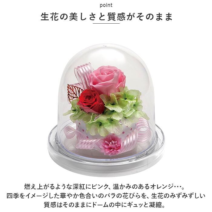 ・燃え上がるような深紅にピンク、温かみのあるオレンジ・・・。四季をイメージした華やか色合いのバラの花びらを、生花のみずみずしい質感はそのままにドームの中にギュッと凝縮。
