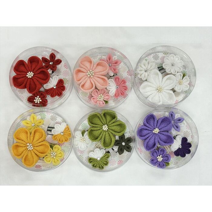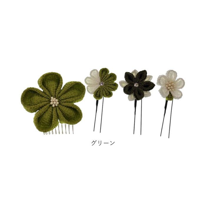 ・上品な光沢感のある生地を使用し、落ち着いた色合いでまとめた大人可愛いつまみ細工の髪飾りセット。