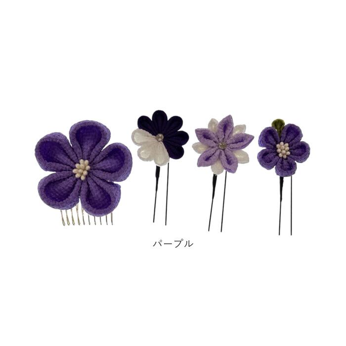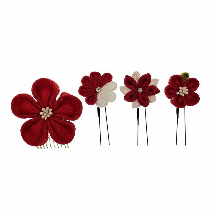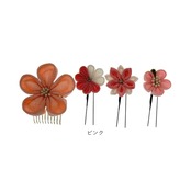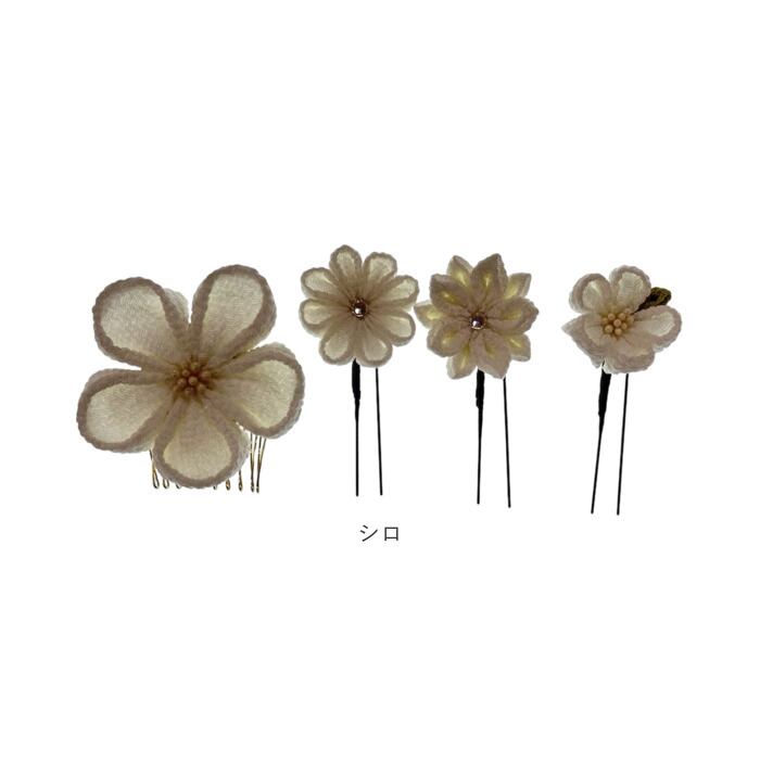 ・大花1点(コーム仕様)と、小花3点(Uピン仕様)の4点セットで、まとめ髪に華やぎとやさしさを添える。