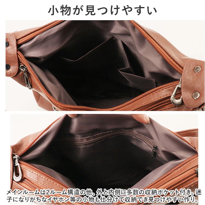 ・メインルームは2ルーム構造の他、外と内側に多数の収納ポケット付き。迷子になりがちなイヤホン等の小物も仕分けて収納でき見つけやすい作り。