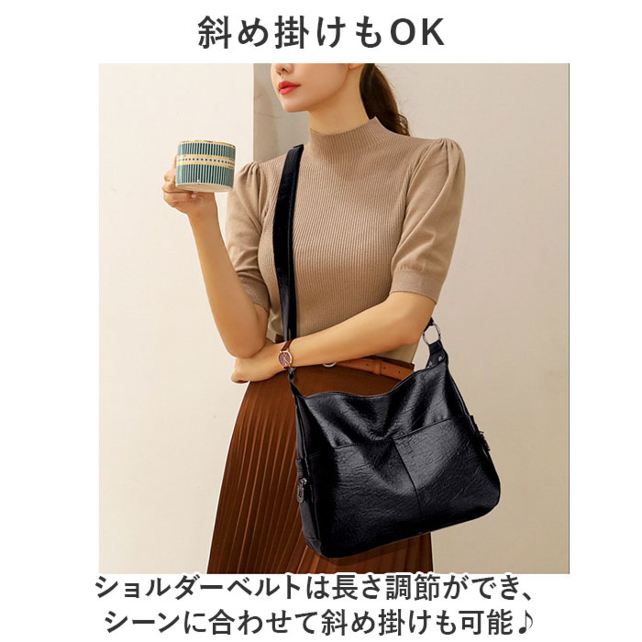 ・ショルダーベルトは長さ調節ができ、シーンに合わせて斜め掛けも可能♪