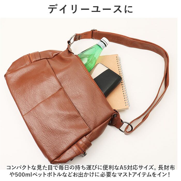 ・コンパクトな見た目で毎日の持ち運びに便利なA5対応サイズ。長財布や500mlペットボトルなどお出かけに必要なマストアイテムをイン!