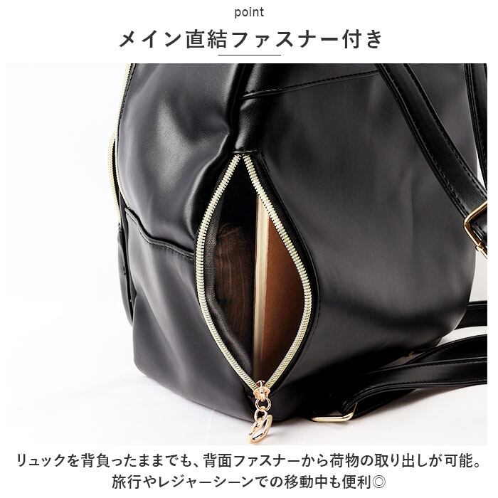 ・リュックを背負ったままでも、背面ファスナーから荷物の取り出しが可能。旅行やレジャーシーンでの移動中も便利◎