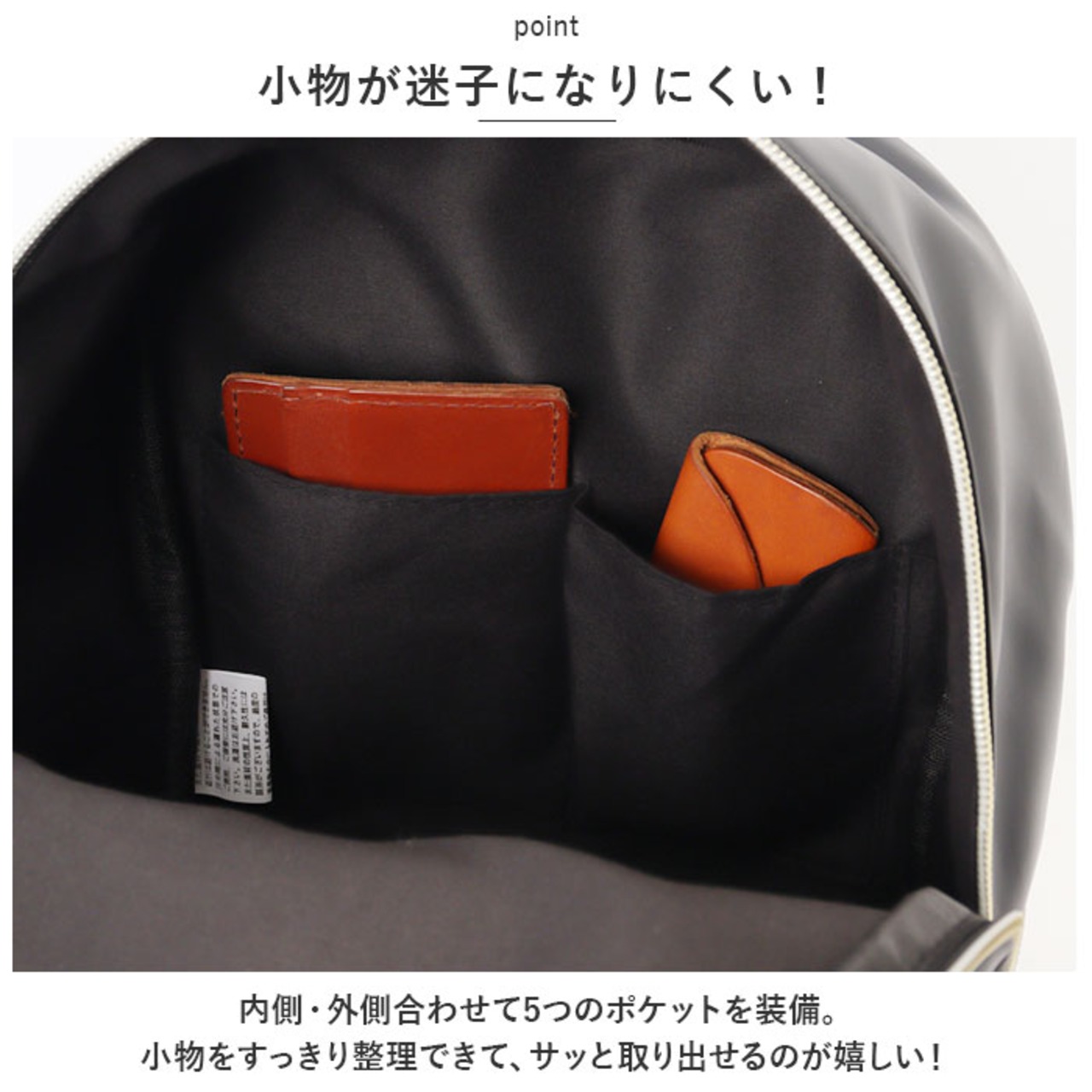 ・内側・外側合わせて5つのポケットを装備。小物をすっきり整理できて、サッと取り出せるのが嬉しい!