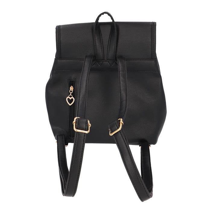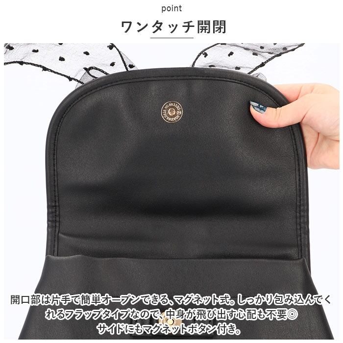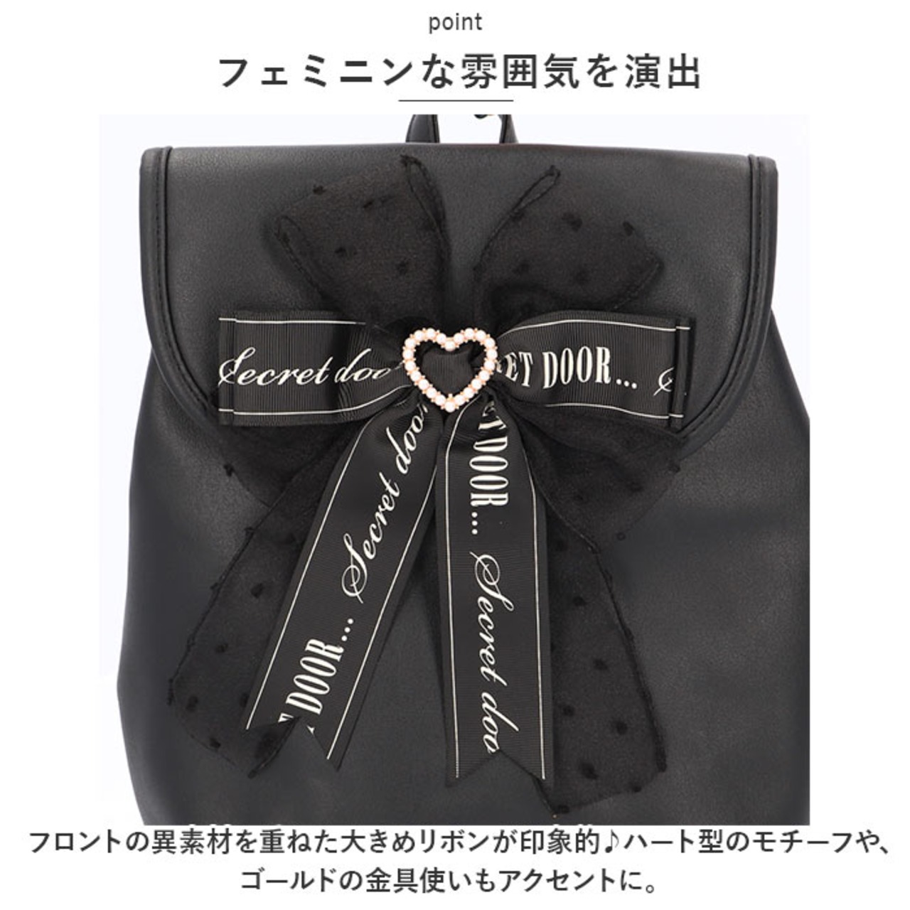 ・フロントの異素材を重ねた大きめリボンが印象的♪ハート型のモチーフや、ゴールドの金具使いもアクセントに。