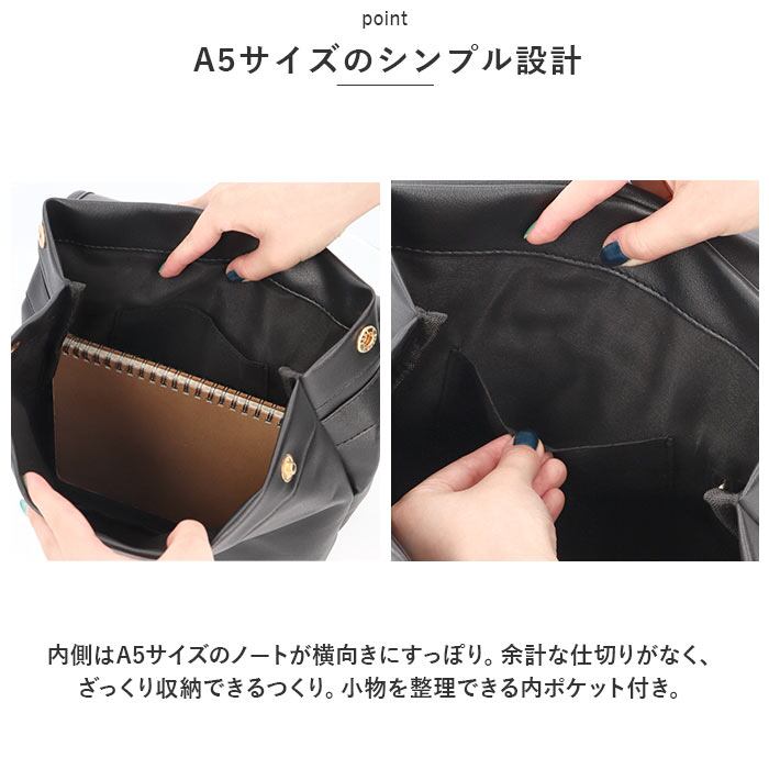 ・内側はA5サイズのノートが横向きにすっぽり。余計な仕切りがなく、ざっくり収納できるつくり。小物を整理できる内ポケット付き。